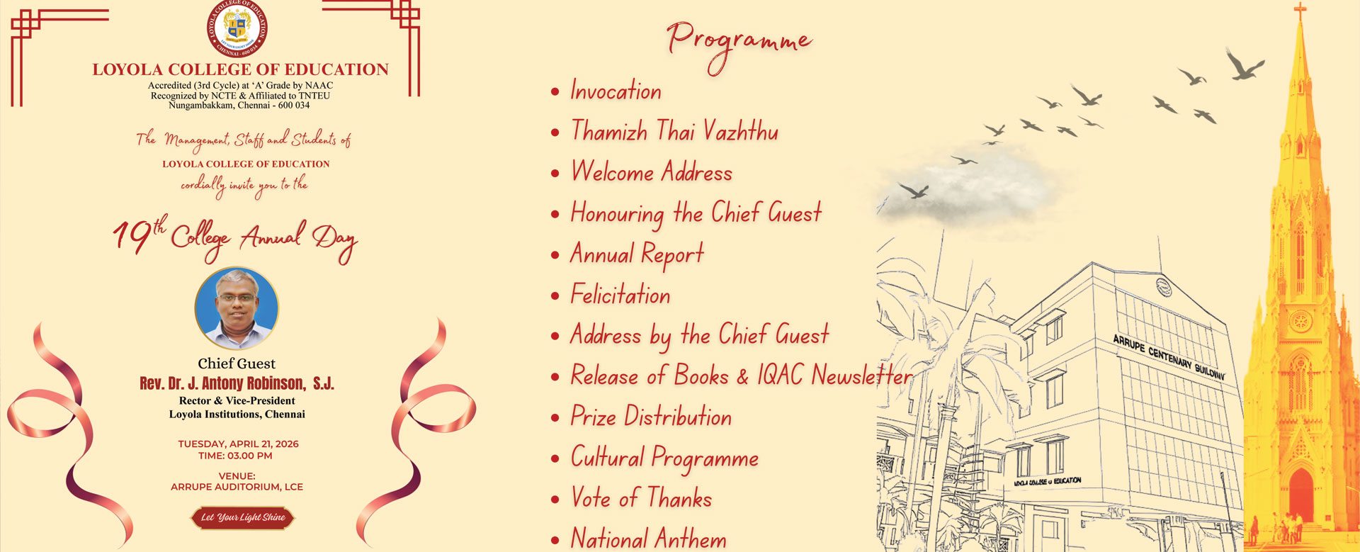 Loyola College of Education, a Jesuit Teacher Education Institution was established in June 2007. It is completely owned and administered by the Loyola College Society registered under the Society Registration Act of 1860 No.5228/1973. It is located in the wide campus of Loyola College of Arts & Science. It is recognized by National Council for Teacher Education (NCTE) and affiliated to Tamil Nadu Teachers Education University (TNTEU). It is accredited at `A` grade with CGPA – 3.79 by NAAC (National Assessment and Accreditation Council) in the 1st cycle which is the highest among the colleges of education in India. In the second cycle it was re-accredited at `A` grade with CGPA–3.48 by NAAC. Read More...